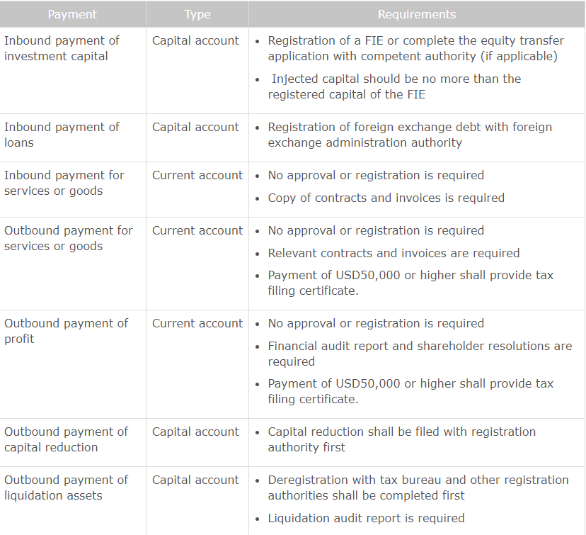 - Any foreign exchange payment to China must have a specific purpose declared to banks in China and shall be classified as either a capital account item or a current account item.